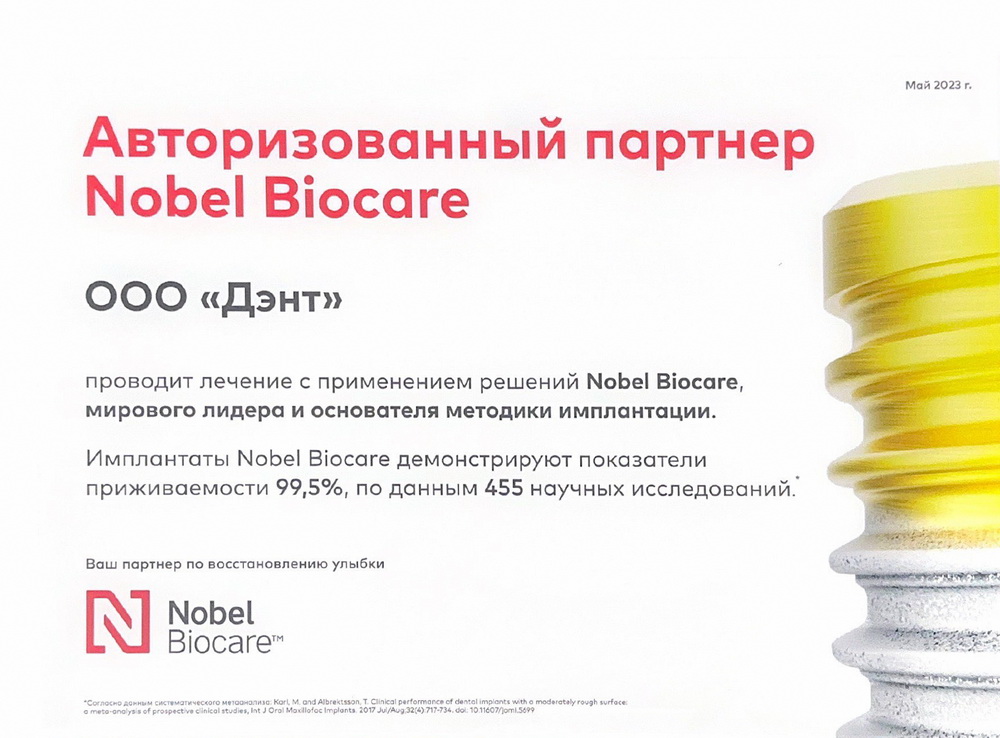 Мы работаем с имплантами ведущих мировых производителей: импланты Alpha Bio (Израиль), Nobel (Швейцария) и Dentium (Южная Корея). Эти системы занимают лидирующие позиции на мировом рынке имплантов. Показатель их приживляемости составляет до 98%.